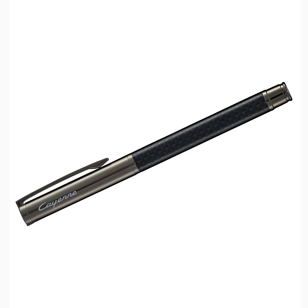 Bolígrafo Porsche de alta calidad con mina azul. El logotipo de Porsche y el nombre del modelo Cayenne adornan la tapa del bolígrafo. Su diseño ergonómico permite escribir sin cansarse incluso durante largos periodos.