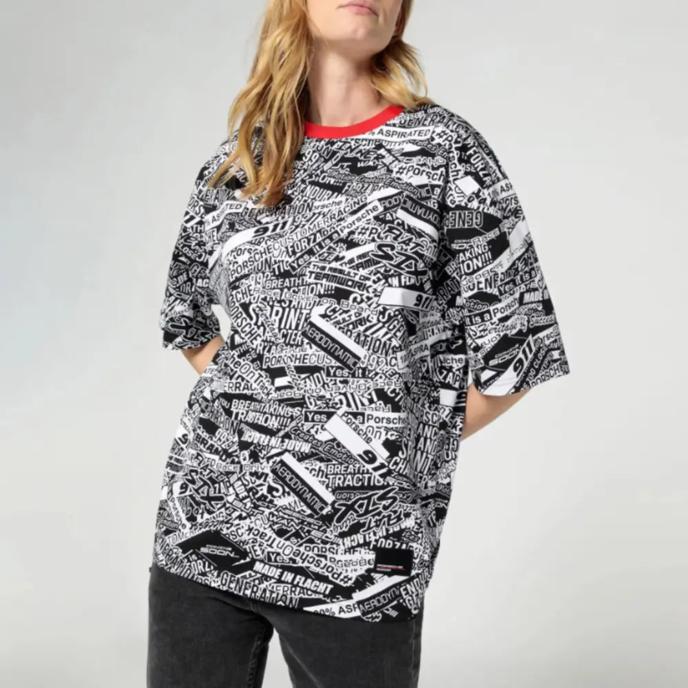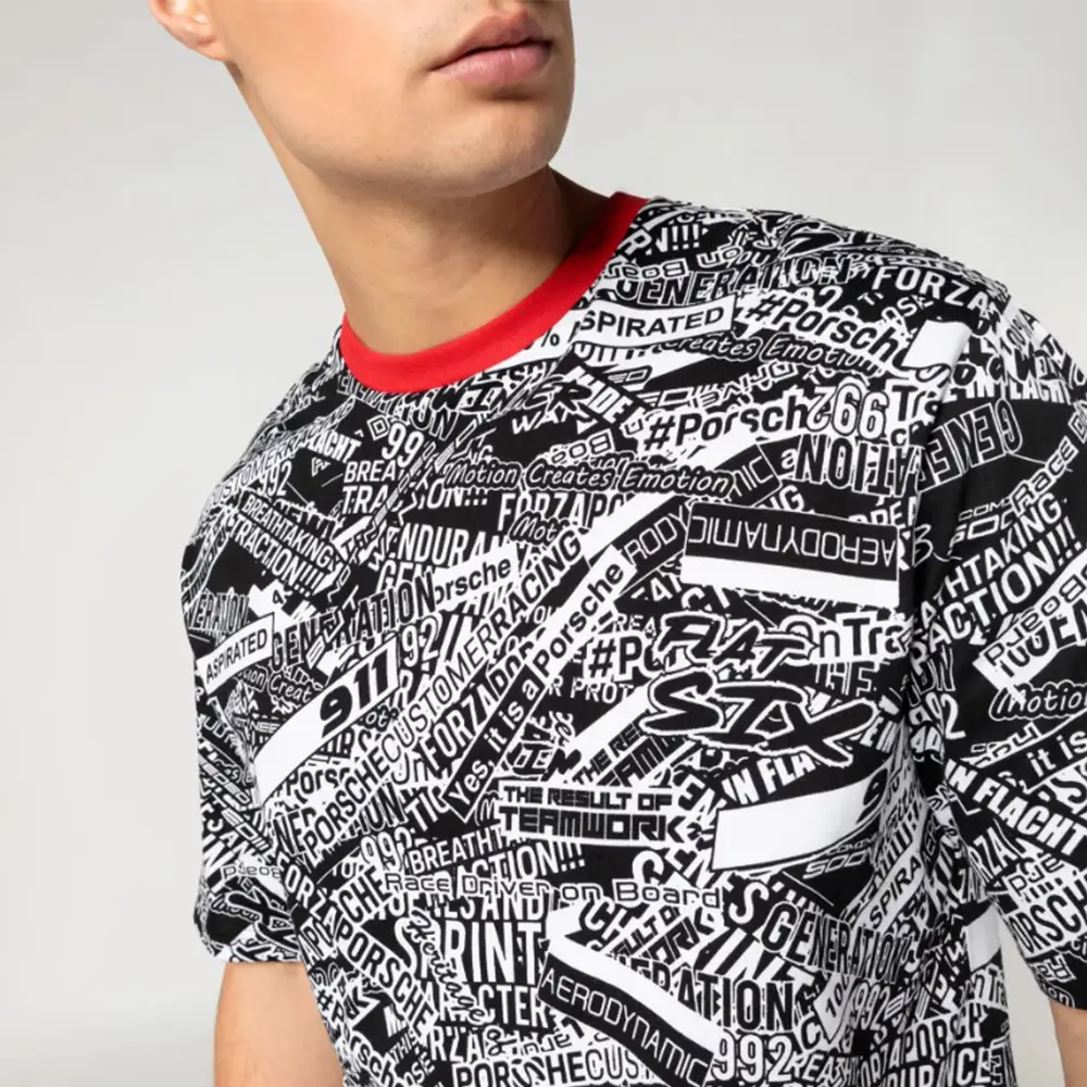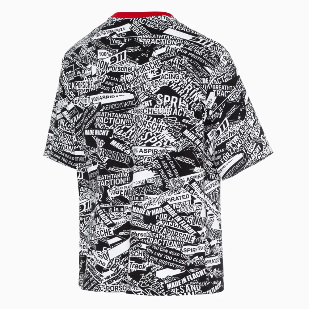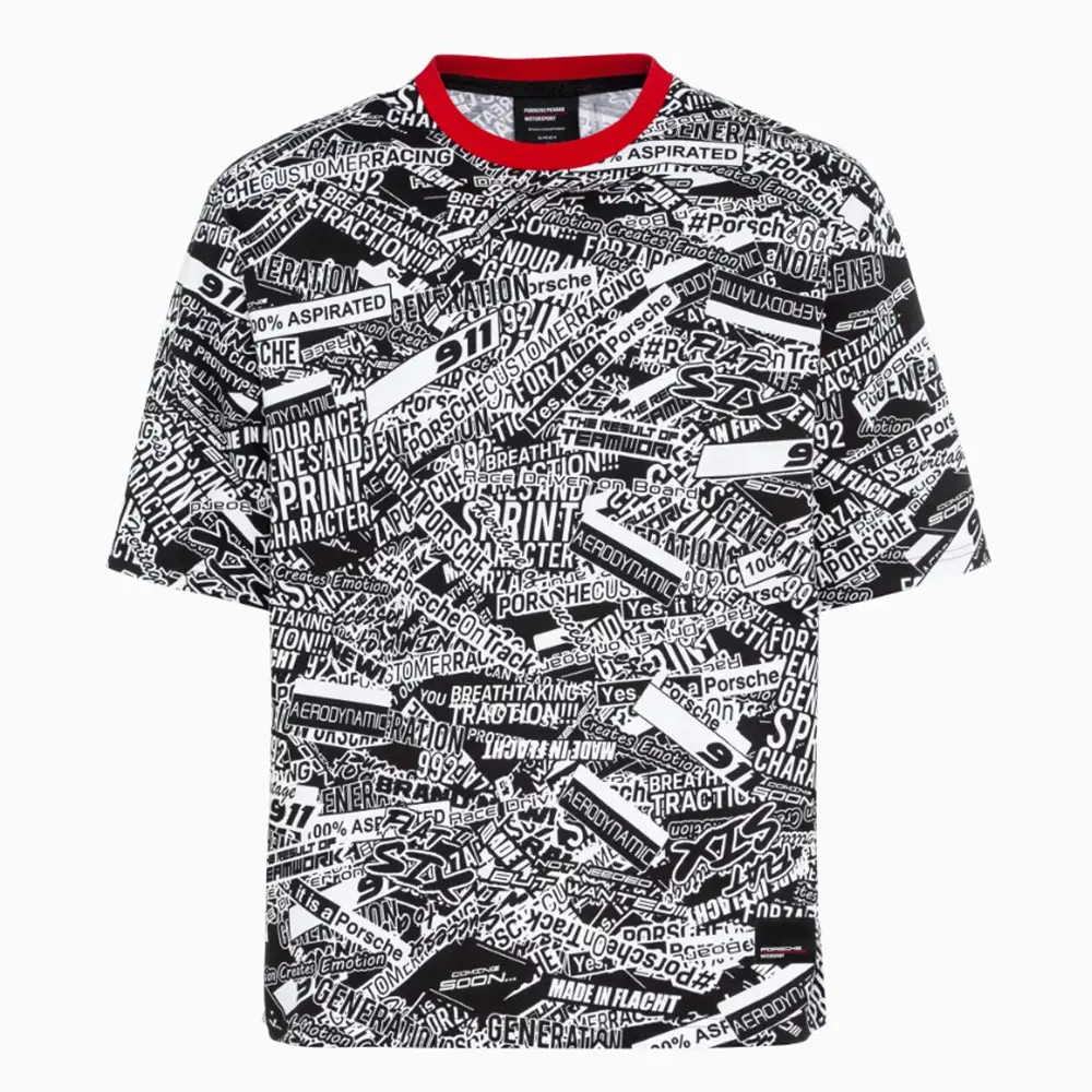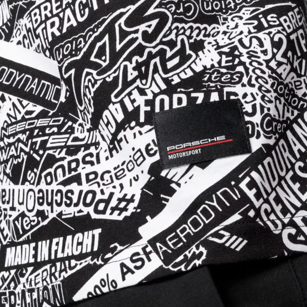 Esta camiseta unisex, confeccionada en algodón 100 % orgánico y con cuello en contraste, llama la atención gracias a su estampado integral, inspirado en el camuflaje del 911 gt3 r (992). El corte ligeramente oversize subraya el aspecto deportivo de la camiseta.