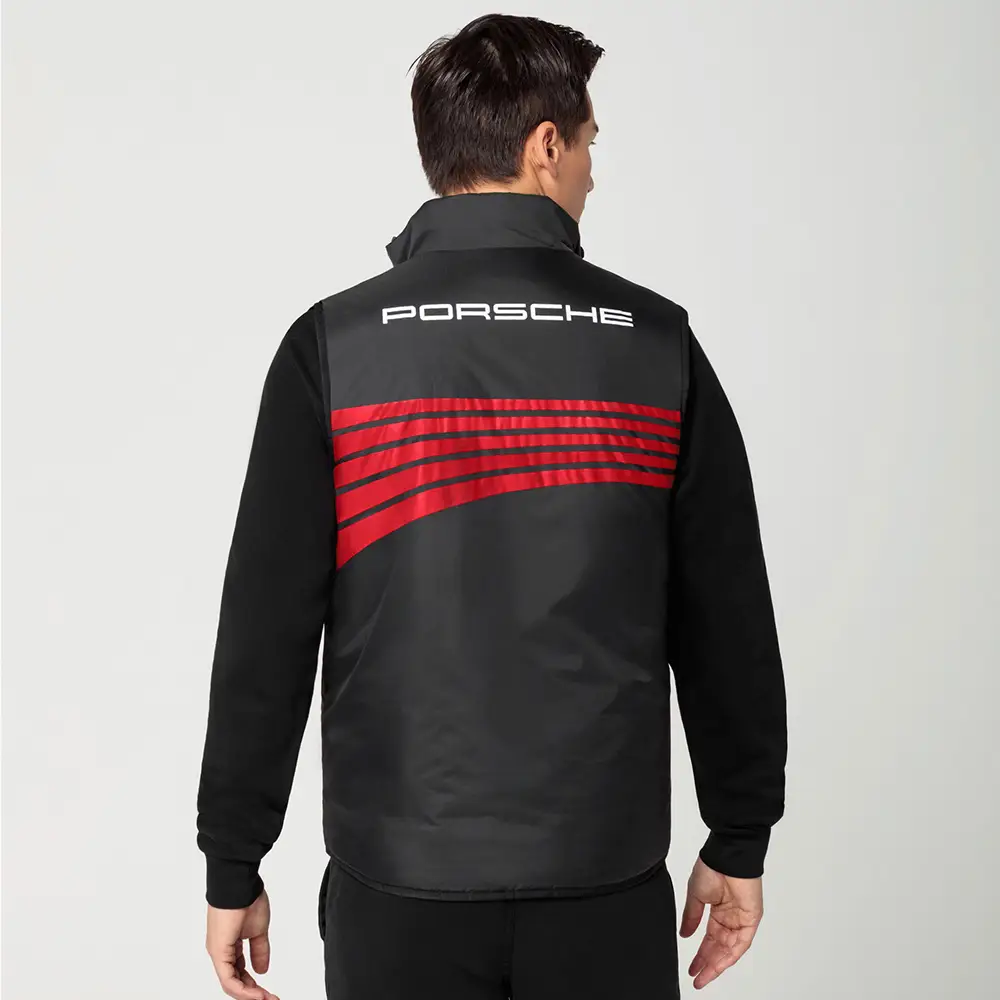 El chaleco de la exclusiva colección porsche penske motorsport muestra un corte regular casual, forro interior acolchado, es perfecto para temporadas de entretiempo o looks deportivos. El logotipo de porsche penske motorsport estampado en el pecho y el estampado de rayas rojas en la espalda hacen que el chaleco sea único y con estilo. El chaleco se puede cerrar con una cremallera en la parte delantera y tiene un bolsillo interior, así como bolsillos laterales con cremallera en el exterior.