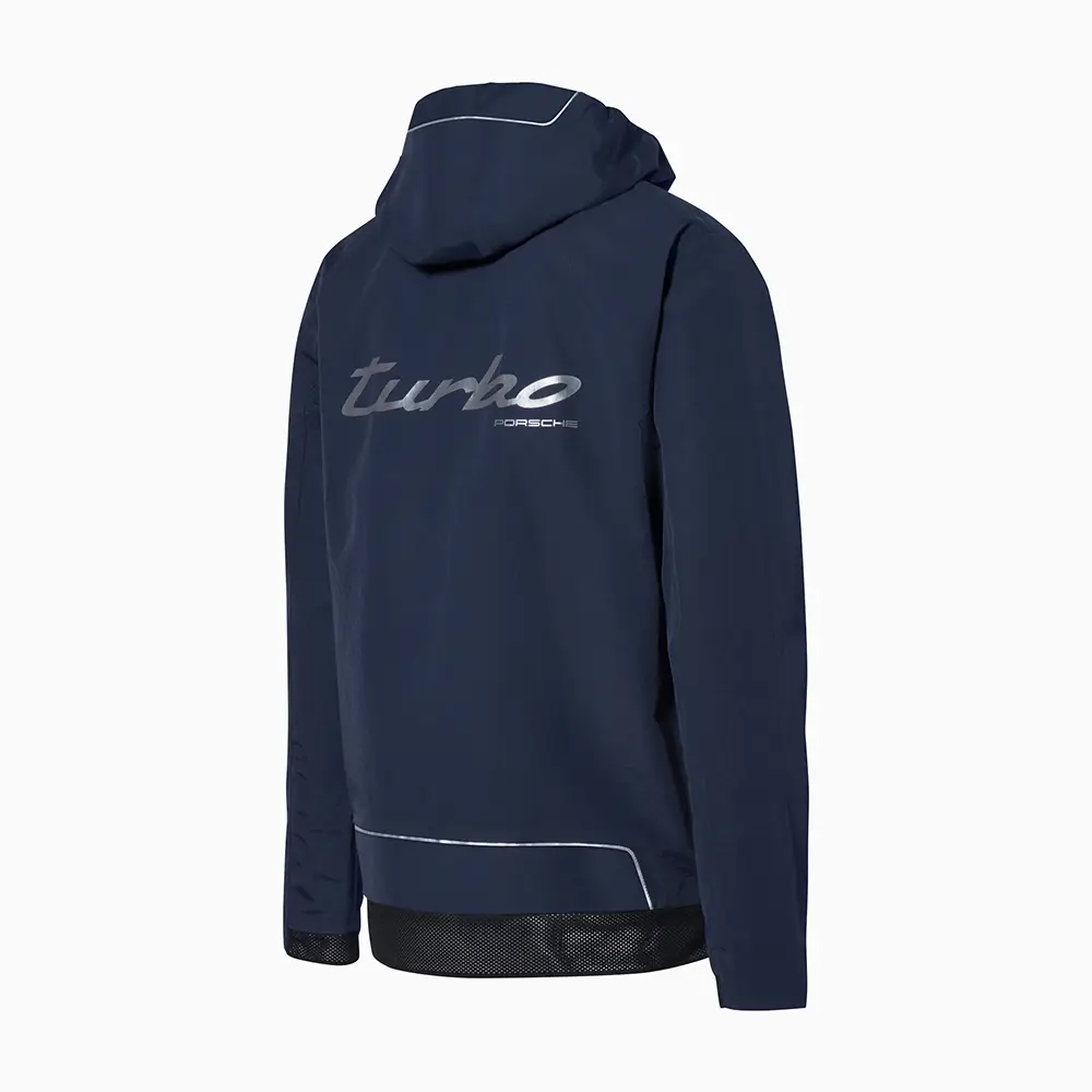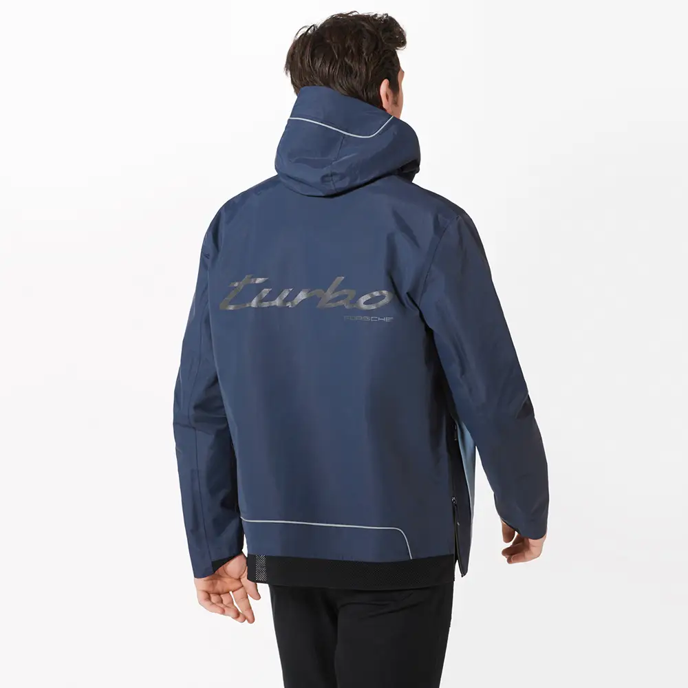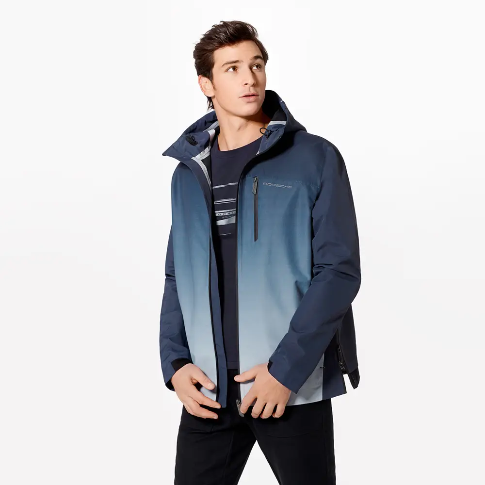 Chaqueta funcional con degradado de color en la parte delantera y la capucha, inspirada en el porsche 911 turbo s. Todas las costuras están pegadas. Esta chaqueta ofrece una protección especialmente buena contra el viento y la lluvia. Con estampado decorativo reflectante «turbo» y «porsche». Con dos bolsillos laterales. Con bolsillo en el pecho y en el interior. El bolsillo interior tiene una abertura para los auriculares. Con ranuras de ventilación en la costura lateral. La mitad del dobladillo y el dobladillo de las mangas con una banda de goma. Capucha con topes de cordón internos. Sin forro.