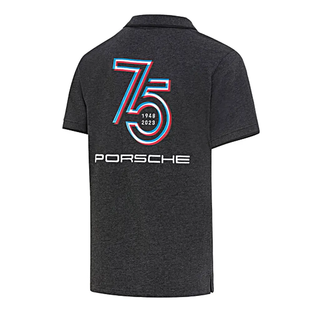 Parte de la exclusiva colección de aniversario homenajea el nacimiento de la marca en 1948, pues fue el 8 de junio de 1948 cuando el primer vehículo deportivo Porsche recibió su permiso general de circulación. Un gran estampado del número 75 con el año bordado adorna la parte trasera de la polo 75y. También se incluye un anagrama Porsche bordado debajo y en el pecho. Pequeños detalles en los colores del aniversario: una banda a rayas en el cuello y en el cierre, así como el hilo del botón de dos tonos completan el diseño.