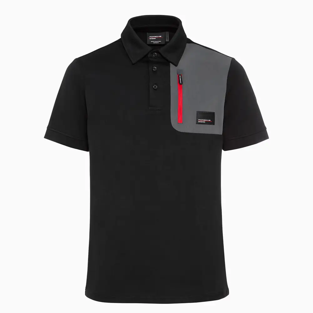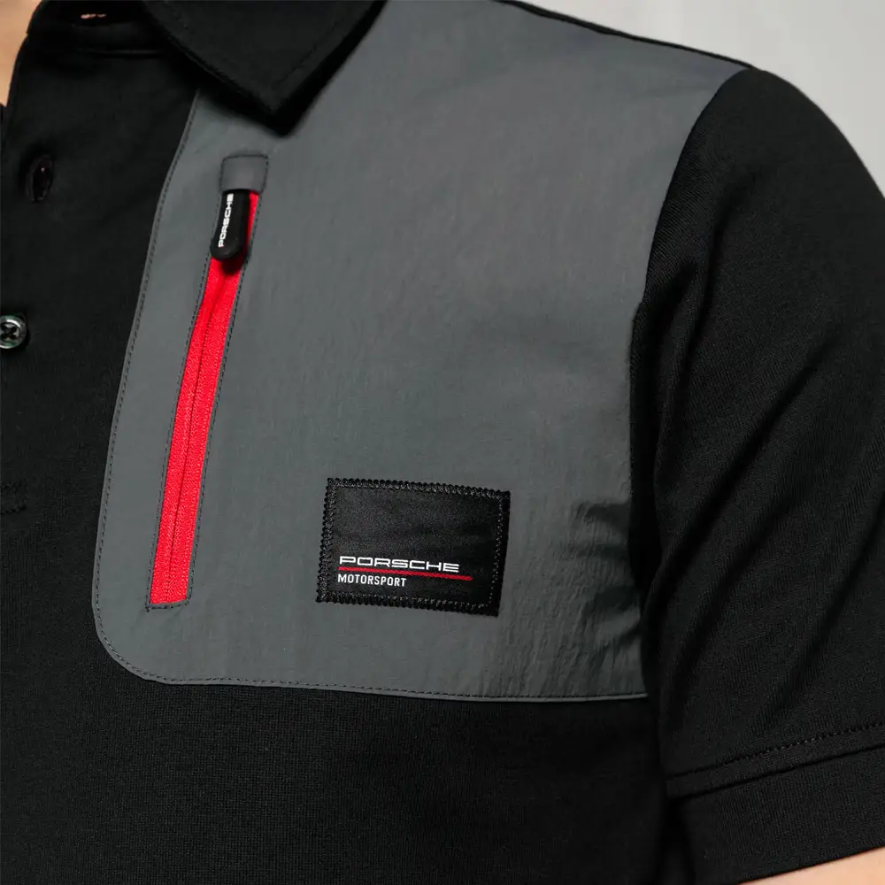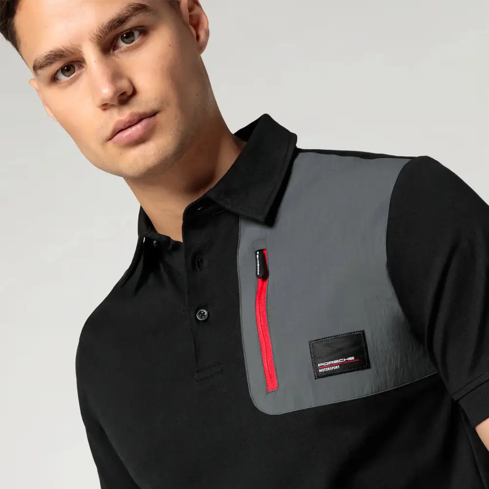 El polo de algodón 100% orgánico combina la conciencia medioambiental con un diseño elegante. El bolsillo de nylon 100% reciclado en el pecho izquierdo con un tirador de cremallera de marca y la etiqueta Porsche Motorsport. Los botones de marca completan el aspecto exclusivo del polo.